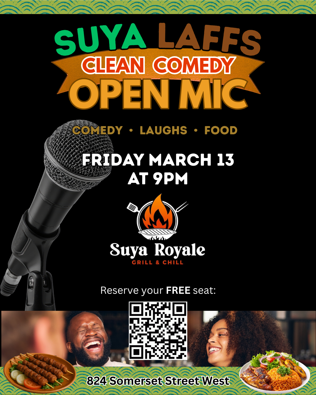 One of the newest comedy rooms I’m helping build is an open mic happening inside a Nigerian restaurant (Suya Royale, 824 Somerset Street West). An open mic is where comedians test material, sharpen their timing, and practice their performances. On Friday March 13, we did a soft launch of a clean-comedy open mic: comedy for all audiences — punchlines with a side of the BEST Jollof in the city.